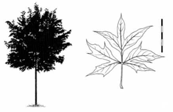 Wuchs: breit runde Krone, kleine Anzahl Gerüstäste, schwach bis mittelstark wachsend, lockerer Wuchs, ältere Triebe ausladend, unregelmäßige Kronenform, Austrieb Anfang/ Mitte April Trieb: im Winter rotbraun, mit dunkelroten Knospen Blatt: ausgewachsen 9 cm bis 11 cm lang und breit, im Kroneninnern deutlich kleiner, Oberseite dunkelgrün, Unterseite heller Blüte: Anfang/Mitte April, gelblichgrün Frucht: kein Ansatz Verwendung: für spezielle Verwendung |