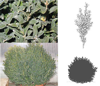 Wuchs: etwas breiter als hoch wachsend, teilweise breiter als hoch, rundlicher, dichter Pflanzenaufbau, sehr dicht verzweigt, sehr kurze Internodien, sehr schwacher Austrieb im Spätsommer, Höhe 46 (- 60) cm, Breite 51 (- 65) cm Blatt: dunkelgrün, leicht blauer Ton, schwach glänzend, elliptisch, konkav, schwach gebogen, klein, Länge 22 mm, Breite 9 mm Blüte: nicht blühend Schnitteignung: sehr gut geeignet wegen des dichten Wuchses, bestens geeignet für kugelige oder quadratische Formen Gesamteindruck: sehr ansprechende Wirkung von Wuchsform und Blatt, vielseitig zu verwenden, auch ohne Schnitt für mittelhohe Einfassungen geeignet, gut für kugelige Formen zu verwenden |