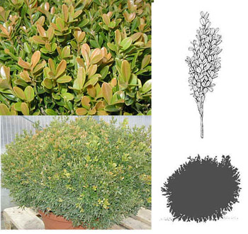 Wuchs: breiter als hoch wachsend, breitbuschiger, halbkugeliger Pflanzenaufbau, sehr dicht verzweigt, sehr kurze Internodien, kräftiger Austrieb im Spätsommer, Höhe 35 (- 40) cm, Breite 55 (- 70) cm Blatt: im Austrieb hellgrün, später mittelgrün, schwach glänzend, breiteiförmig, konkav, leicht gebogen, klein, Länge 19 mm, Breite 8 mm Blüte: nicht blühend Schnitteignung: gut geeignet wegen des dichten Wuchses, bestens für flache Formen oder breite Einfassungen geeignet Gesamteindruck: sehr vielseitig aufgrund der flachen Wuchsform zu verwenden, jedoch anfällig für Spinnmilben, Frost und wegen des hellen Blattes oft krank aussehen kräftiges Schneiden fördert Widerstandsfähigkeit und Pflanzenaufbau |