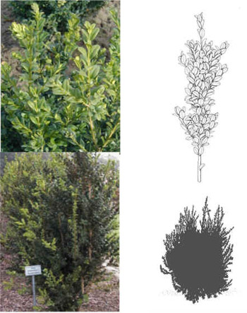 Wuchs: deutlich höher als breit, aufrechte Wuchsform, teilweise lockere Anordnung der Triebe, einzelne Triebe straff aufrecht und vorstehend, dicht verzweigt, lange Internodien, einzelne Triebe verkahlen, kräftiger Austrieb im Spätsommer, graugrüne Triebfarbe und dadurch deutlich unterscheidbar von B. sempervirens L. 'Handsworthiensis', auffallende Triebform, Höhe 118 (- 130) cm, Breite (- 80) 75 cm Blatt: dunkelgrün, leichter blauer Ton, flach und stark gebogen, breitelliptisch, schwach glänzend, groß, Länge 26 mm, Breite 13 mm, auffallende Blattform Blüte: schwach bis mittelstark blühend Schnitteignung: kräftiger Korrekturschnitt fördert Verzweigung und Pflanzenaufbau, für besondere Formen wegen der groben Triebe und des großen Blattes weniger geeignet, regelmäßiger Schnitt verhindert verkahlen Gesamteindruck: dekorative Wirkung von Blattform und Wuchsform, überwiegend als Solitärpflanze und bedingt für aufrechte Formen geeignet, häufiger Korrekturschnitt zur Verbesserung des Pflanzenaufbaus erforderlich, unterscheidet sich von Buxus sempervirens 'Handsworthiensis' durch die grüne Triebfarbe |