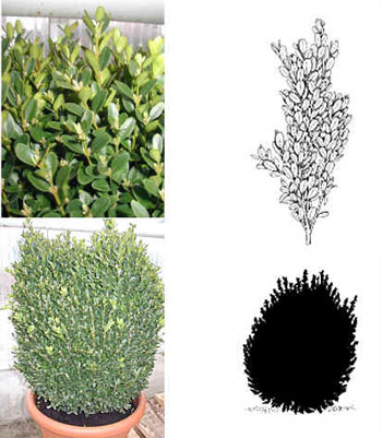 Wuchs: höher als breit wachsend, sehr dichter fast kugelförmiger Pflanzenaufbau, voll geschlossene Pflanze, kurze Internodien, dicht verzweigt, fehlender oder sehr schwacher Austrieb im Spätsommer, Höhe 45 (- 60) cm, Breite 30 (- 40) cm Blatt: dunkelgrün, breitelliptisch, schwach konkav, flach, leicht glänzend, klein, Länge 18 mm, Breite 11 mm Blüte: nicht blühend Schnitteignung: gut geeignet wegen des dichten, kugelförmigen Wuchses, bestens geeignet für niedrige schmale Einfassungen oder kleine kugelige, kegelförmige oder quadratische Formen Gesamteindruck: hervorragend für niedrige Einfassungen und Formen geeignet, sehr dichter, dekorativer Pflanzenaufbau, leichter Schnitt höchstens bei Einfassungen erforderlich, stets dunkelgrüne Blattfarbe |